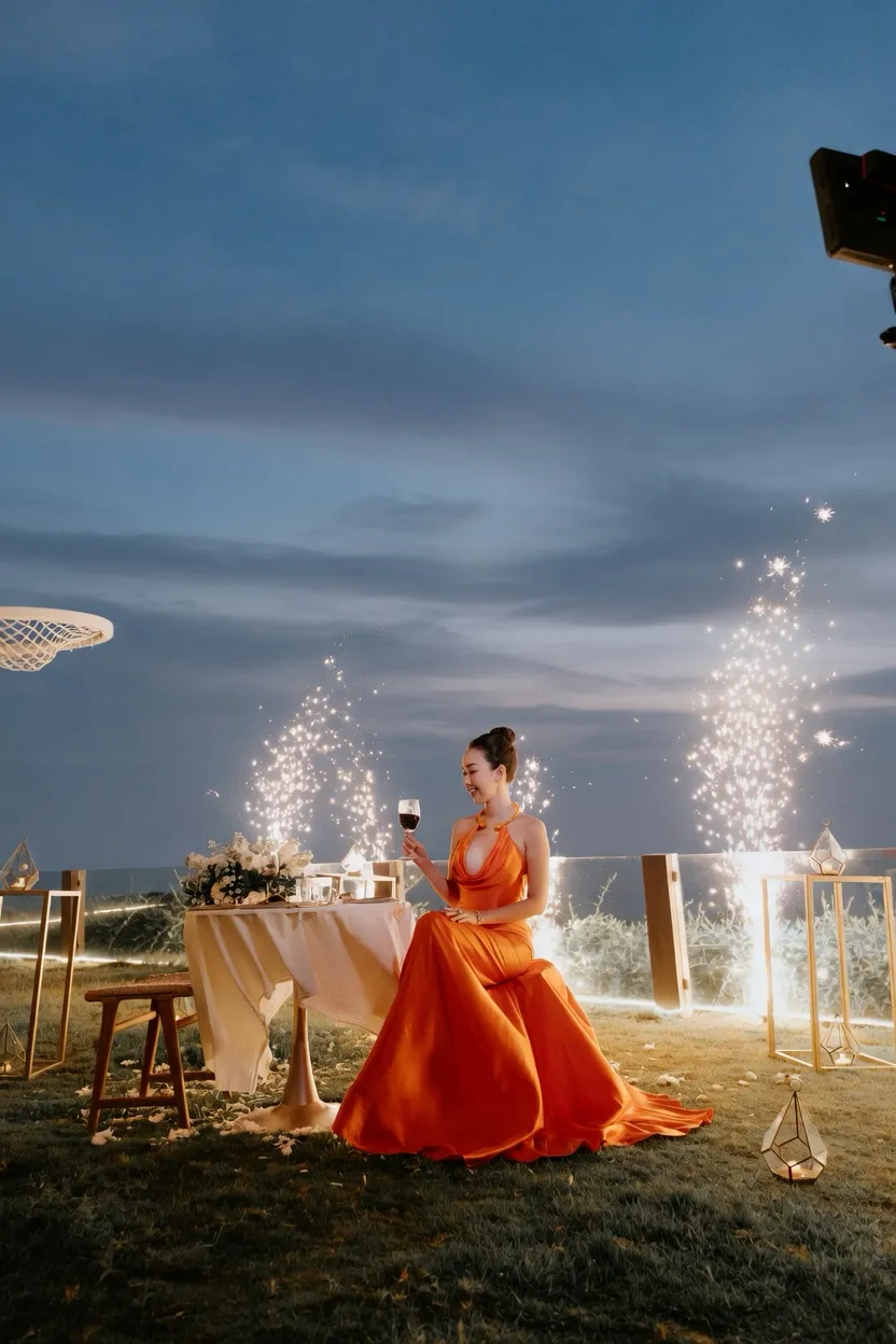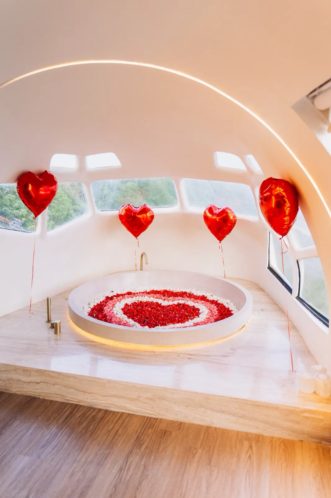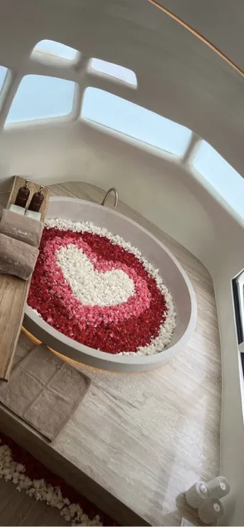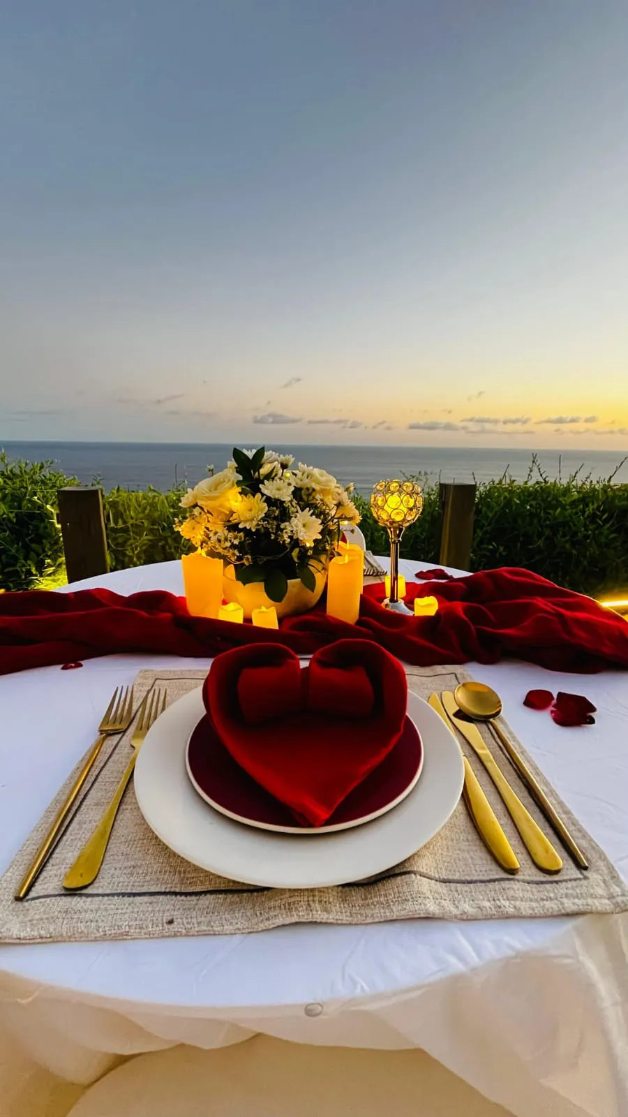 Termasuk hidangan fine dining untuk dua tamu, karangan bunga segar, lilin, pencahayaan romantis, air mineral atau berkarbonasi, serta layanan Butler.